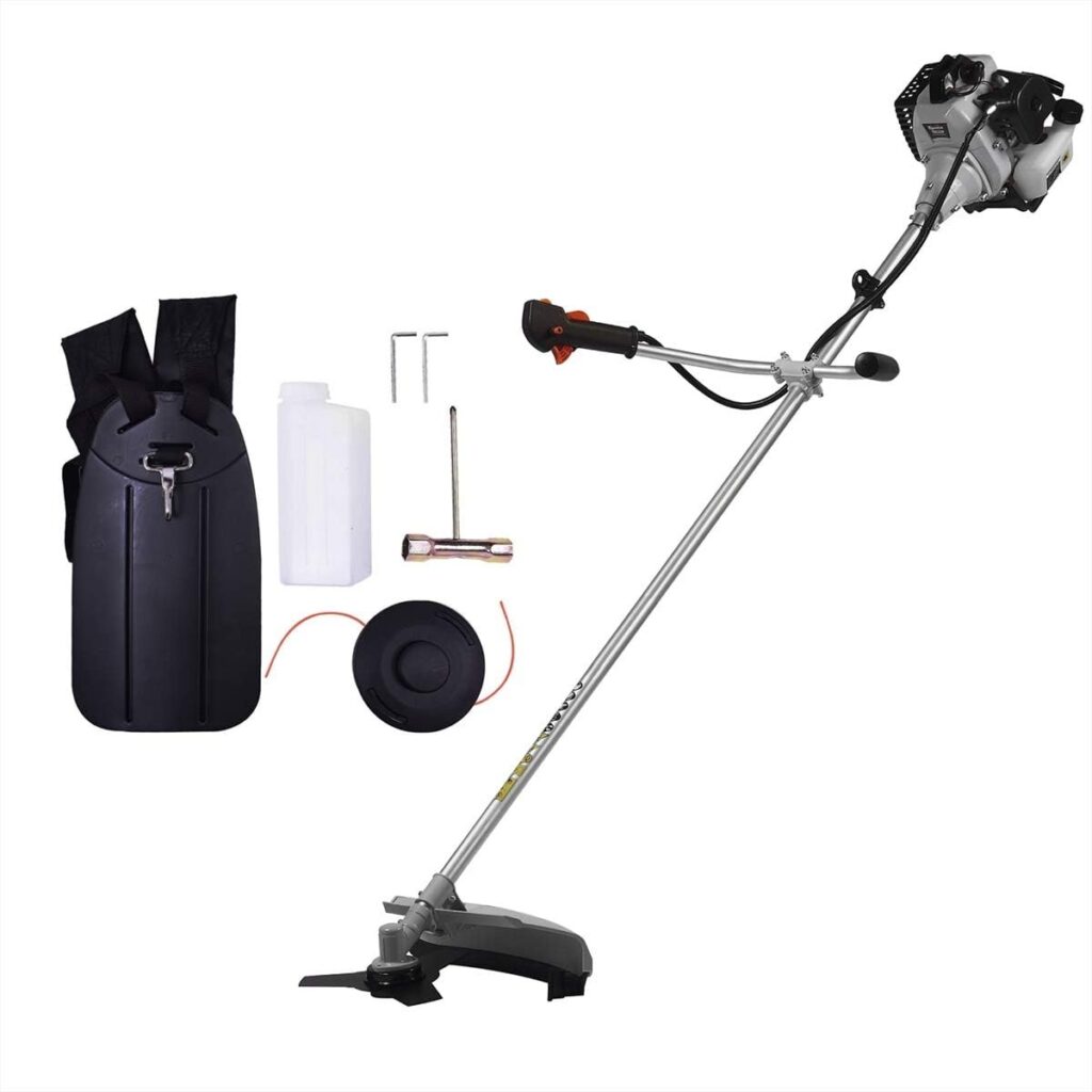 Ideal para fazendas, chácaras e áreas verdes, a roçadeira inclui faca de 3 pontas, carretel de nylon, dosador de combustível e jogo de chaves, entregando ótimo custo-benefício.